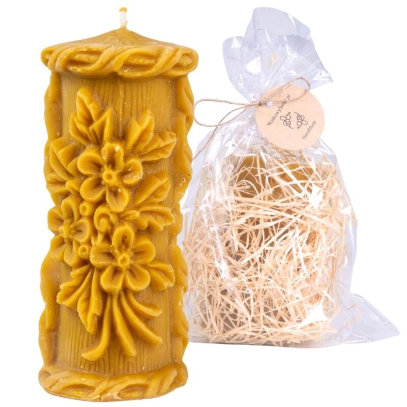 Mała świeca Paschał wykonana w 100% z wosku pszczelego to idealny wybór na Wielkanoc. Jej cylindryczny kształt i żółty kolor nadają jej klasyczny wygląd, a wyrzeźbione kwiatowe wzory zapewniają wyjątkowe walory dekoracyjne. Górna i dolna krawędź świecy mają falowane zdobienia, co dodatkowo podkreśla jej elegancję. Świeca ma wymiary ~190 mm wysokości i ~80 mm średnicy, a waży ~609 g. Elegancko zapakowana w celofanowy woreczek z naturalnymi wiórami i ozdobnym sznurkiem.