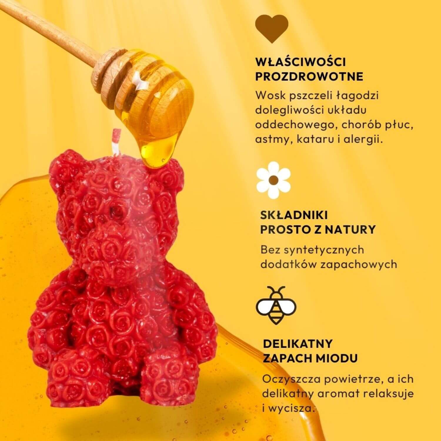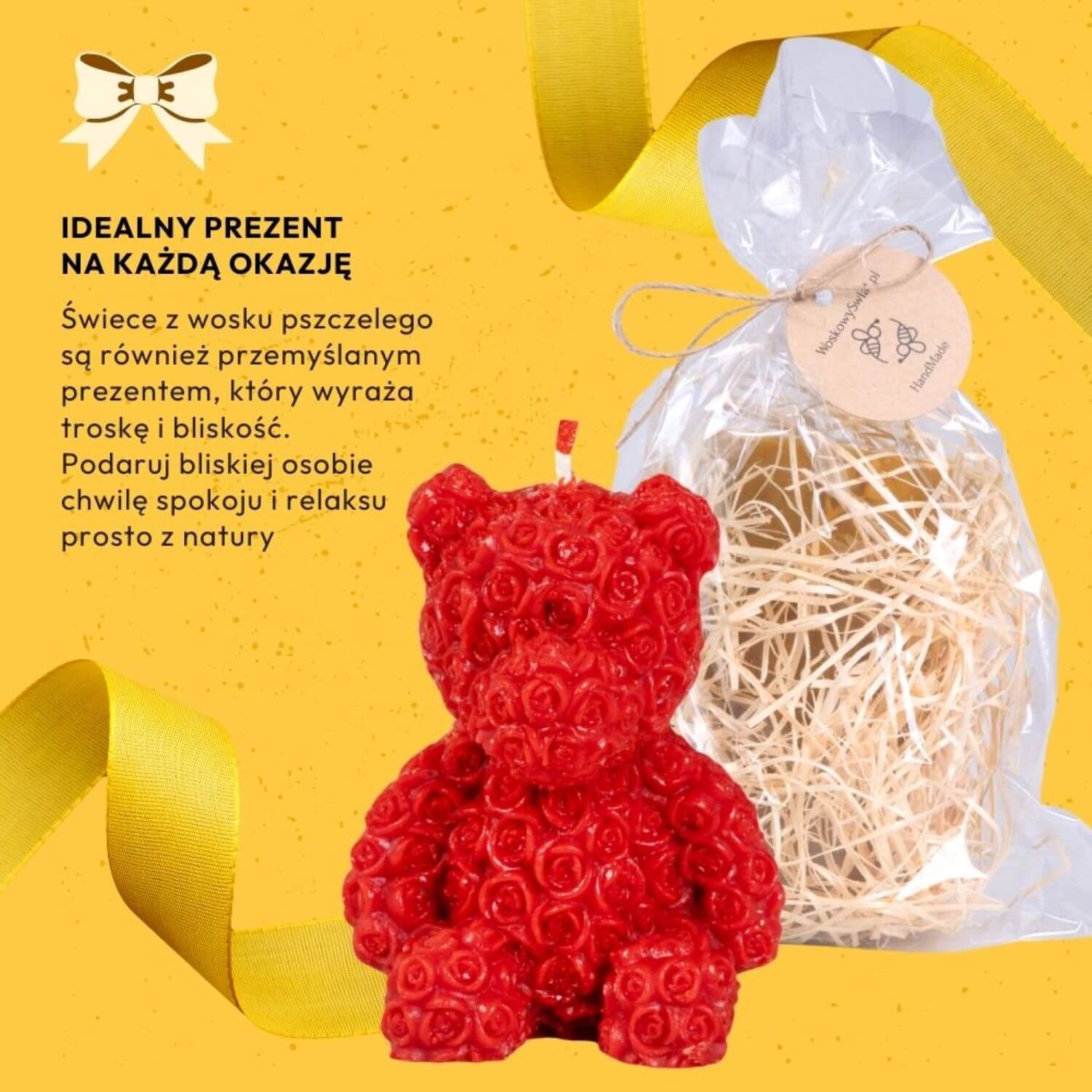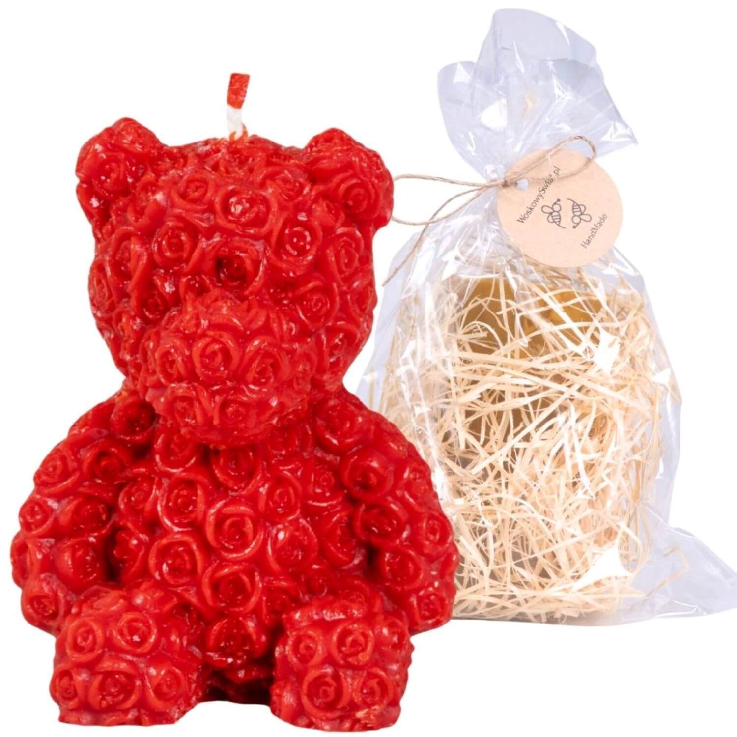 Czerwona świeca różany miś z wosku pszczelego to produkt najwyższej jakości, ręcznie wykonany, w pełni z naturalnego wosku pszczelego. Świeca przyciąga wzrok intensywnym czerwonym kolorem i misternym wzorem małych różyczek, które pokrywają jej powierzchnię. Kształt misia jest doskonale odwzorowany, z wyraźnymi uszami, łapami i pyskiem. Produkt jest starannie zapakowany w elegancki celofanowy woreczek z naturalnymi wiórami drzewnymi i ozdobny sznurek z logo stanowi piękne wykończenie. Wysokość świecy to ~98 mm, a jej waga wynosi ~132 g.