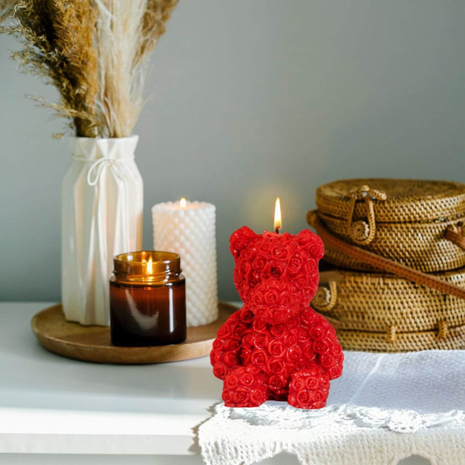 Ta urocza świeca w kształcie misia, uformowana z drobnych róż, to doskonały wybór zarówno na prezent, jak i jako stylowa ozdoba do wnętrz. Jej intensywny czerwony kolor wprowadza do pomieszczenia ciepło i romantyczny nastrój, doskonale komponując się z różnymi aranżacjami. Czerwona świeca różany miś została wykonana z naturalnego wosku pszczelego, dzięki czemu jest w pełni ekologiczna i bezpieczna dla zdrowia – pozbawiona parafiny i sztucznych dodatków.
