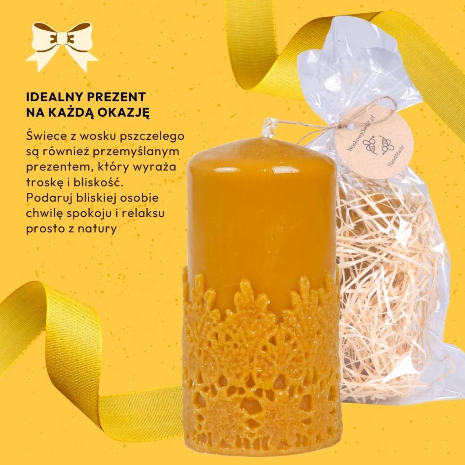 Świeca koronkowy walec duży z wosku pszczelego to bardzo dobry pomysł na prezent. Z pewnością sprawi radość osobom mającym niebanalny styl wystroju wnętrza, jak i tym, którzy kochają kontakt z naturą.