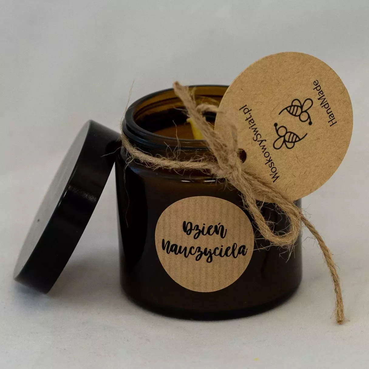 Świeca w słoiku na Dzień Nauczyciela to niezapomniany upominek wykonany z 100% naturalnego wosku pszczelego. Każdy słoiczek przyciąga swoją unikalną etykietą i naturalnym wyglądem, ozdobiony sznurkiem jutowym i zawieszką „Handmade”. Aromat miodu tworzy ciepły, kojący klimat idealny na każdą okazję. Zamów już dziś i wyraź swoją wdzięczność w wyjątkowy sposób!