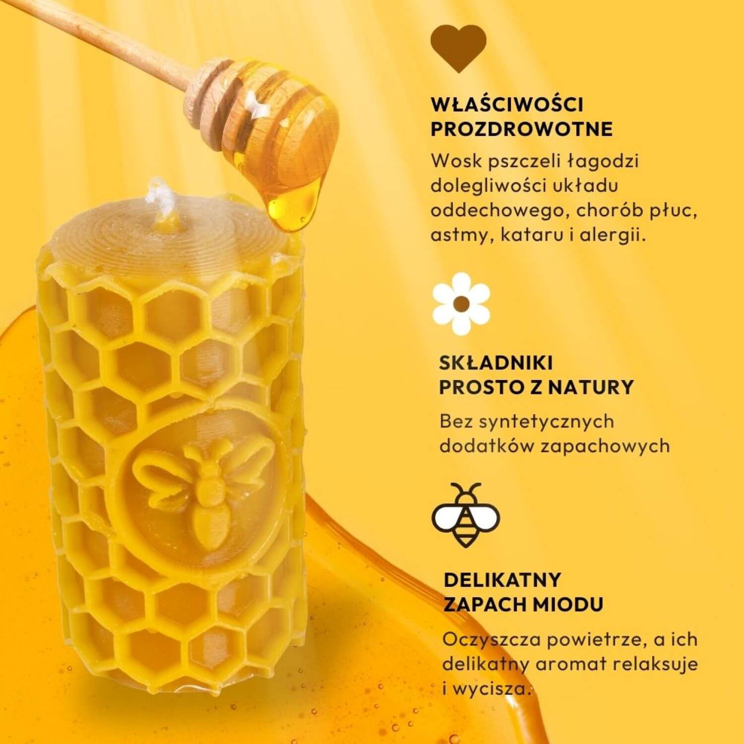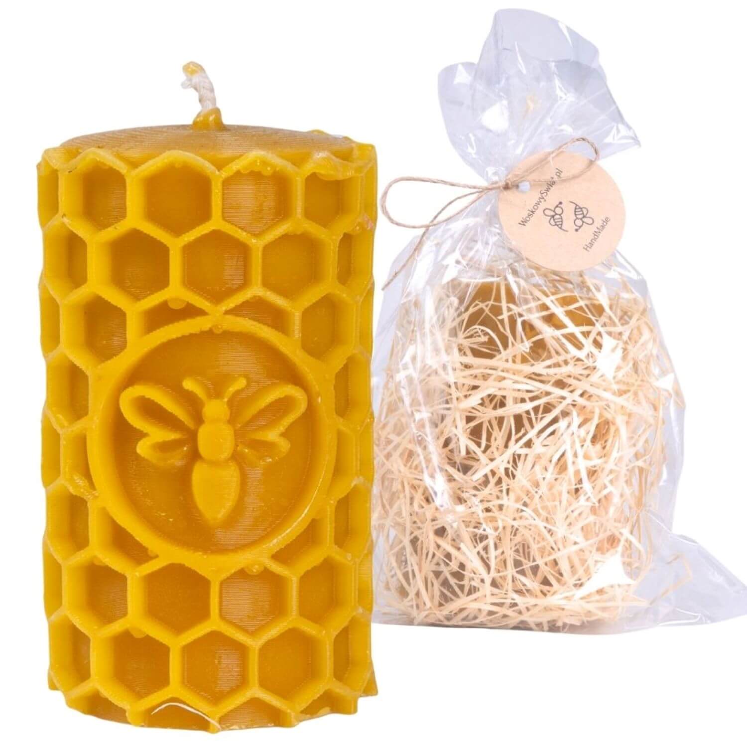 Świeca Walec w Heksagony z pszczołą z wosku pszczelego idealnie nadaje się na prezent, dla kogoś kto interesuje się pszczelarstwem. Może stanowić ciekawe uzupełnienie wystroju wnętrza.