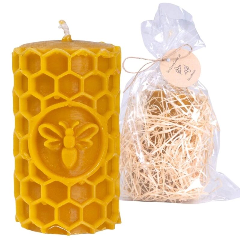 Świeca walec z motywem pszczelim 1 z wosku pszczelego idealnie nadaje się na prezent, dla kogoś kto interesuje się pszczelarstwem. Może stanowić ciekawe uzupełnienie wystroju wnętrza.